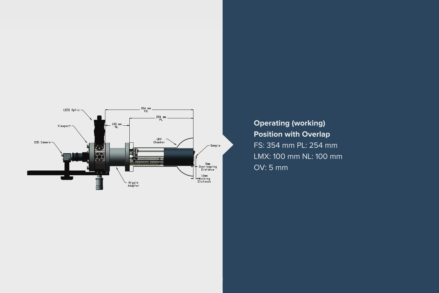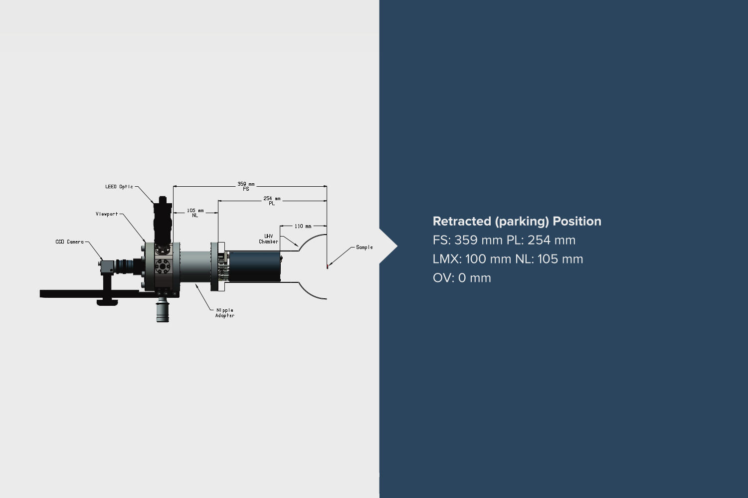 FS = 159mm + 2LMX - OV; where FS is the flange to sample distance, LMX is the retraction length, OV is the overlapping length, PL is the port length and NL is the nipple length.