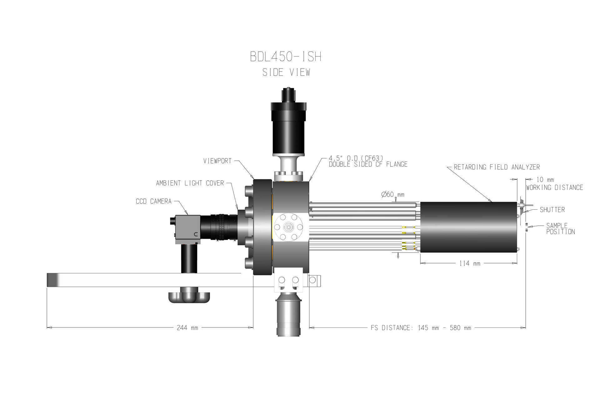 The LEED 450 optics is controlled using either a LPS075-D or LPS300-D power supply. The LPS075-D is used to operate the optic in LEED mode only whereas the LPS300-D in conjunction with the LOA10-AES lock-in controller and AUS30 input coupler is used to operate the optics in LEED and AES modes. Integral shutter (Model ISH-45) and LaB6 filament (Model LaB6) are further options.