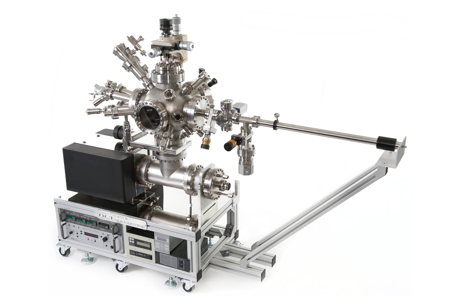 In addition, OCI Vacuum Microengineering also specializes in the design and construction of complete UHV systems based on your custom requirements. The common elements of these systems include precision UHV chambers, a main pump (usually ion pump), an auxiliary pump (usually turbomolecular), a precision sample manipulator, a mounting framework with leveling feet and vacuum gauging.